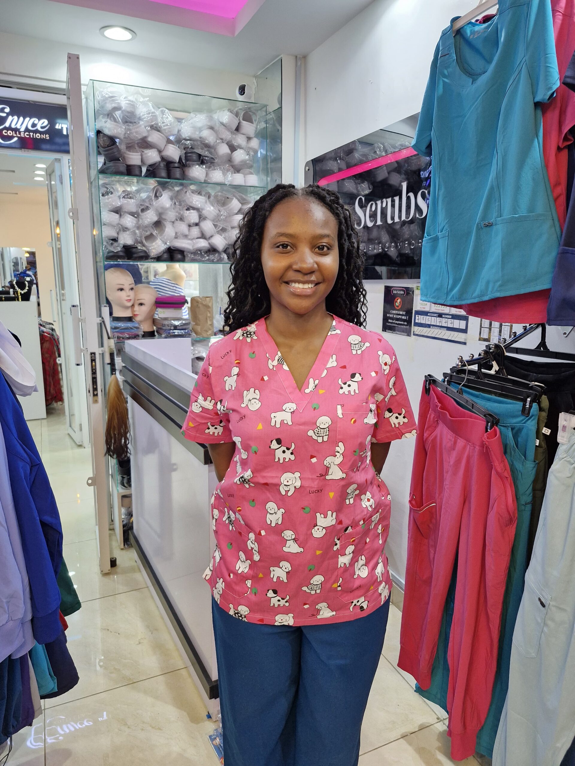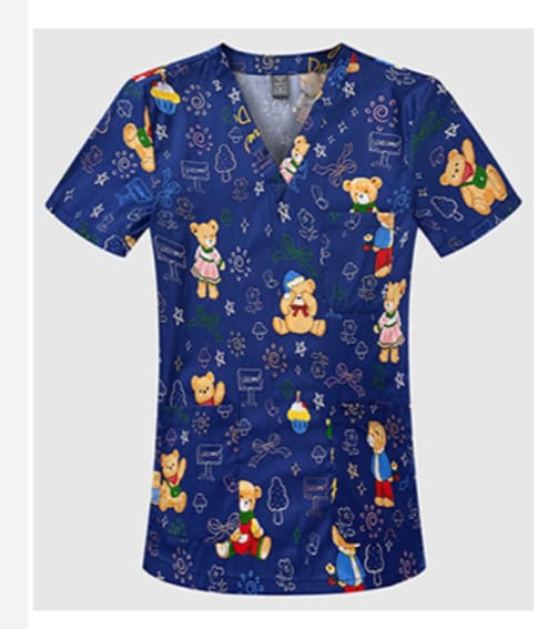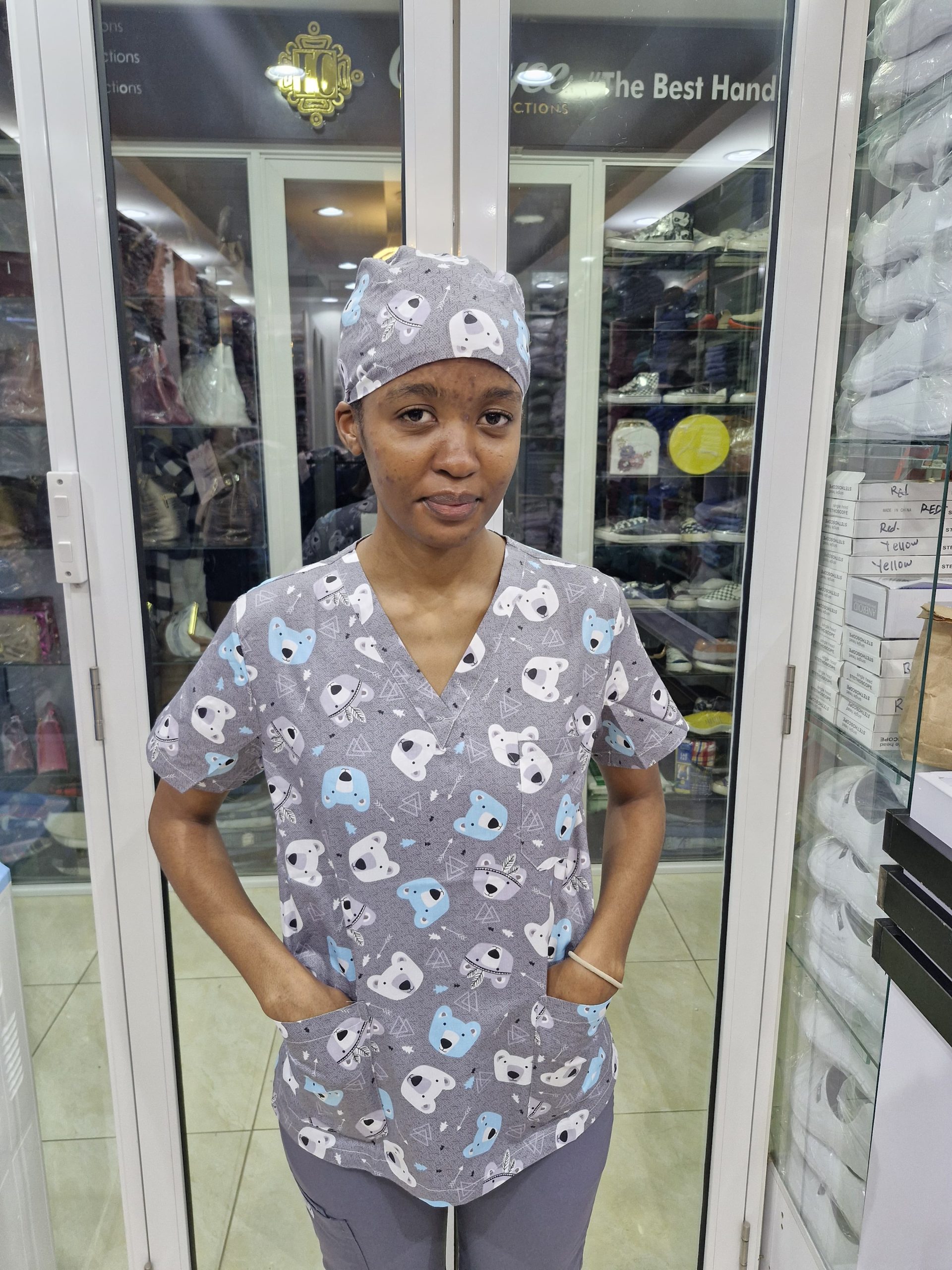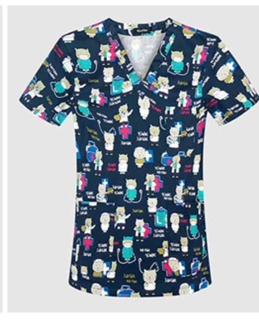 A printed scrub distinguishes you from colleagues in plain colours, makes you more approachable to young patients, and meets the uniform requirements at most Kenyan private hospitals and clinics.