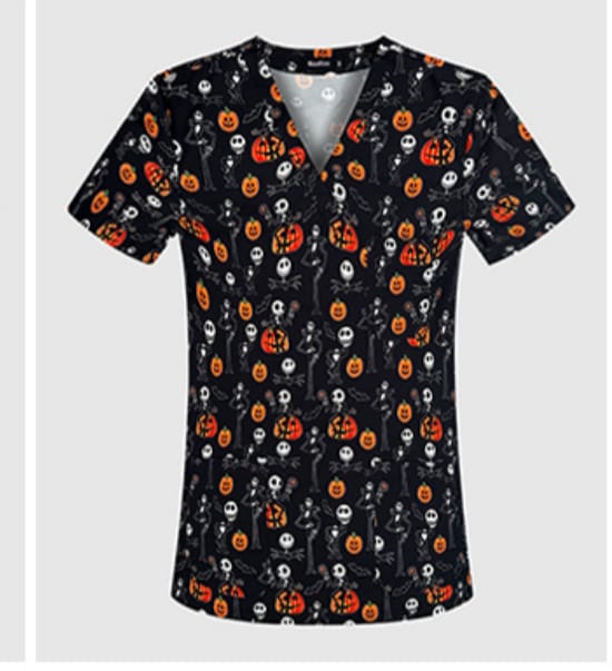 The floral print scrub set at Jojo’s Scrubs is made from a 65% polyester, 35% cotton blend. The fabric weight sits between light and medium, meaning it is not sheer under ward lighting but does not trap heat during a long shift. Flatlock stitching at the seams prevents rubbing on the arms and waistband. The print is dye-sublimated into the fabric, not a surface print, so it survives repeated disinfectant washes without cracking or peeling.